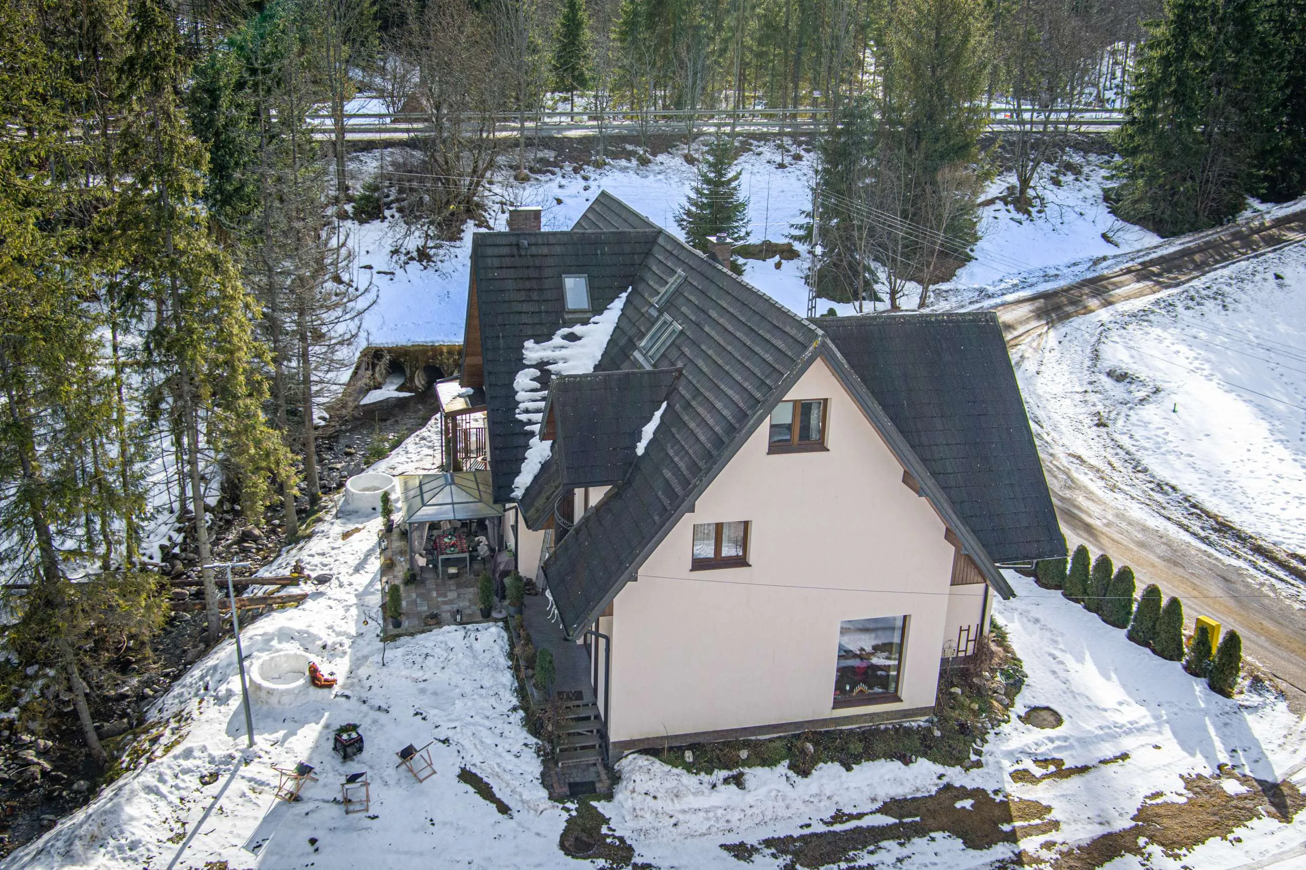 Jednym z najbardziej wyjątkowych miejsc w Rezydencji są tarasy położone tuż nad górskim potokiem. Szum wody, zapach świerków i widok na las tworzą idealne warunki do odpoczynku.